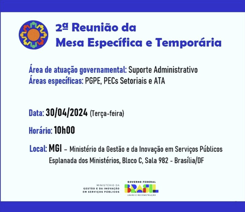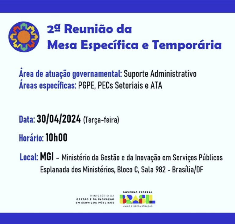 A reunião foi realizada no 9° andar do Bloco C da Esplanada dos Ministérios, contando com a participação do Secretário de Relações de Trabalho, José Lopez Feijóo, junto com equipe técnica da SRT, e do Secretário de Gestão de Pessoas, José Celso Cardoso Jr. Na reunião, a SRT apresentou proposta de reajuste e enviará formalmente às entidades participantes para análise e deliberação.